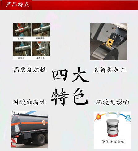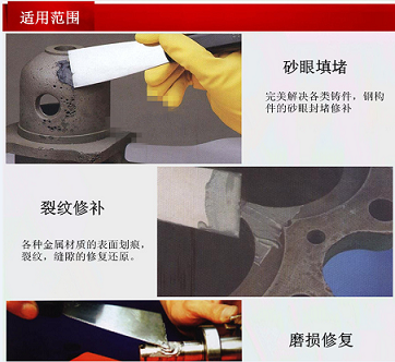 適用于鋼鐵零件磨損修補及劃傷、裂紋等損傷修復(fù)。機(jī)械強度高;抗磨損,耐酸堿腐蝕;能與金屬完美結(jié)合。