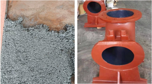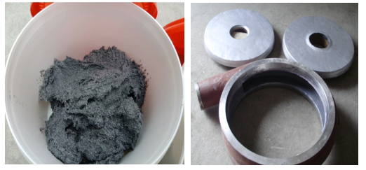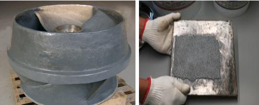 ( 1 )表面處理:在設(shè)備耐磨防腐修復(fù)之前,對(duì)于設(shè)備修復(fù)面要做表面處理工藝,在除油除潮后,以角磨機(jī)或噴砂方法將待修補(bǔ)表面處理成均勻的粗糙表面,以增強(qiáng)修補(bǔ)材料與修補(bǔ)表面的粘結(jié)力強(qiáng)度。