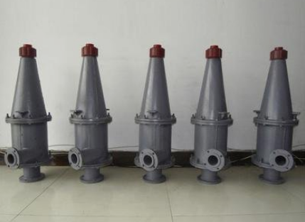 旋流器是一種將固液兩相混合物在離心力和重力的作用下進行分離的設備?;旌弦阂砸欢ǖ膲毫η邢蜻M入旋流器,在圓柱腔內高速旋轉?;旌衔镏忻芏却蟮某煞盅剌S向向下運動,并沿徑向向外運動,到達錐體段后沿外壁向下運動,并由底部口排出;密度小的成分向軸線方向運動,并在軸線中心形成一向上運動的渦旋,然后由溢流口排出。旋流器廣泛應用于選礦、洗煤、化工領域。