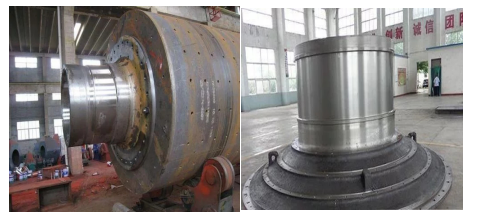 新科機械設備修復中心,經過十幾年的實踐,總結出了一套有效的解決球磨機進出料口以及端蓋磨損的方案。